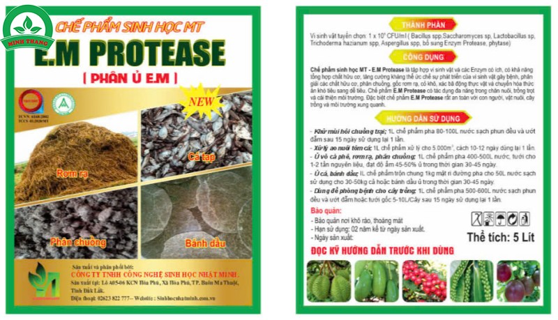 Chế phẩm sinh học MT - E.M Protease là một tập hợp vi sinh vật và các Enzym có ích, có khả năng tổng hợp chất hữu cơ, tăng cường kháng thể ức chế sự phát triển của vi sinh vật gây bệnh, phân giải các chất hữu cơ, phân chuông, gốc rơm rạ, cỏ khô, xác bã động thực vật và chuyển hóa thức ăn khó tiêu sang dễ tiêu. Chế phẩm E.M Protease có tác dụng đa năng trong chăn nuôi, trồng trọt và cải thiện môi trường. Đăc biệt chế phẩm E.M Protease rất an toàn với con người, vật nuôi, cây trồng và môi trường xung quanh.